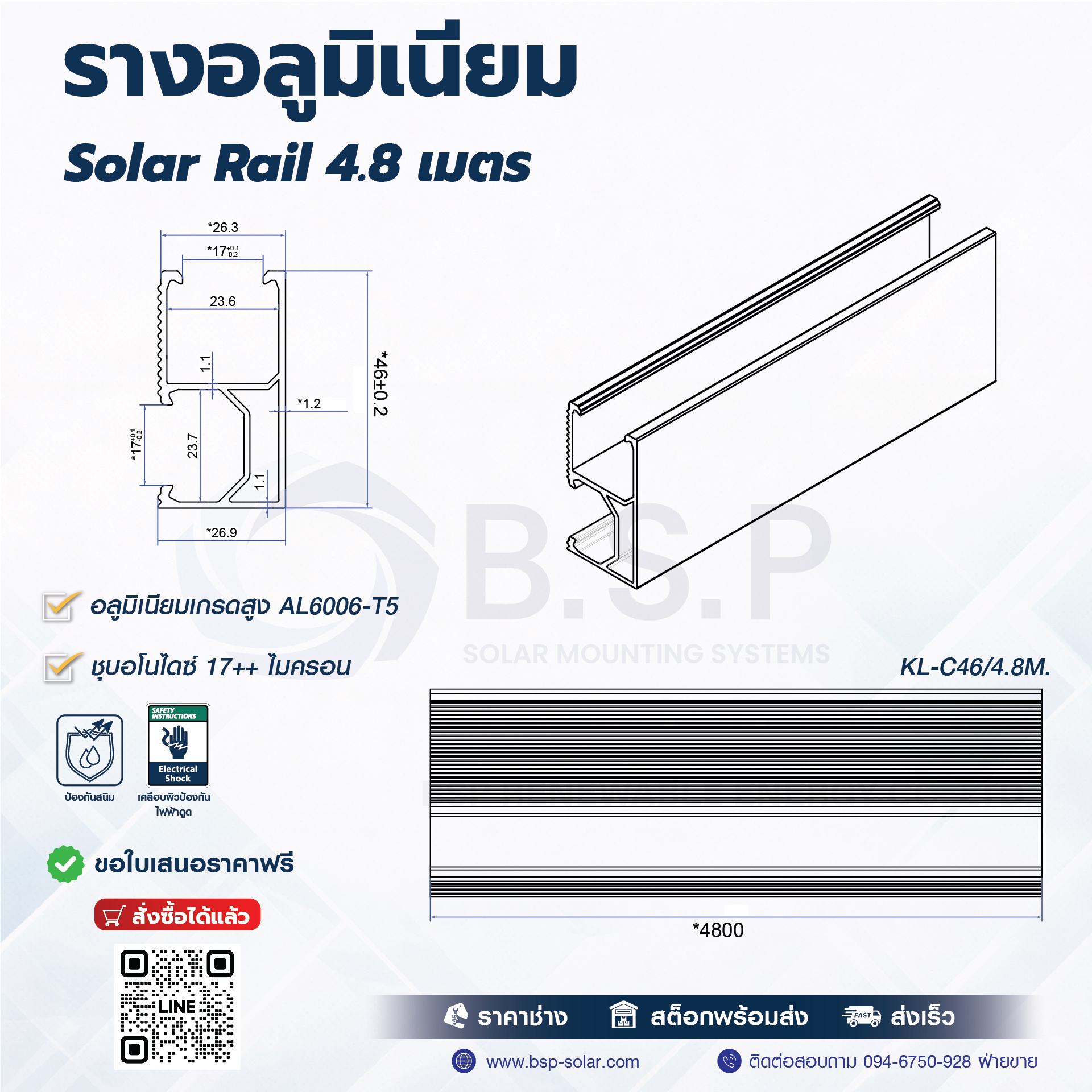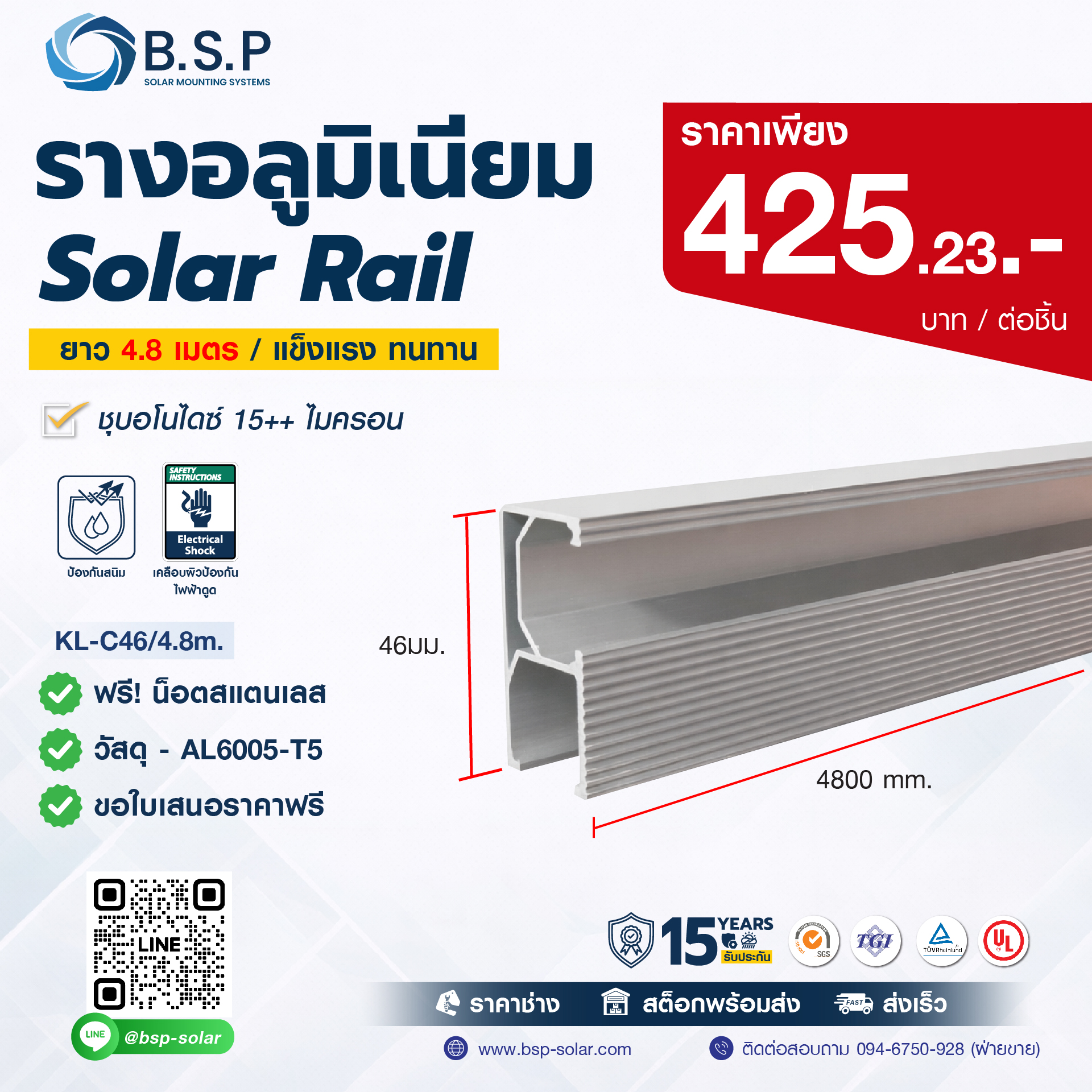 Solar Rail รุ่น KL-C46/4.8m เป็นรางอลูมิเนียมสำหรับติดตั้งแผงโซลาร์เซลล์ ออกแบบให้มีความสูง 46 มม. ช่วยเพิ่มความแข็งแรงของโครงสร้าง โดยยังคงน้ำหนักเบาและติดตั้งง่าย