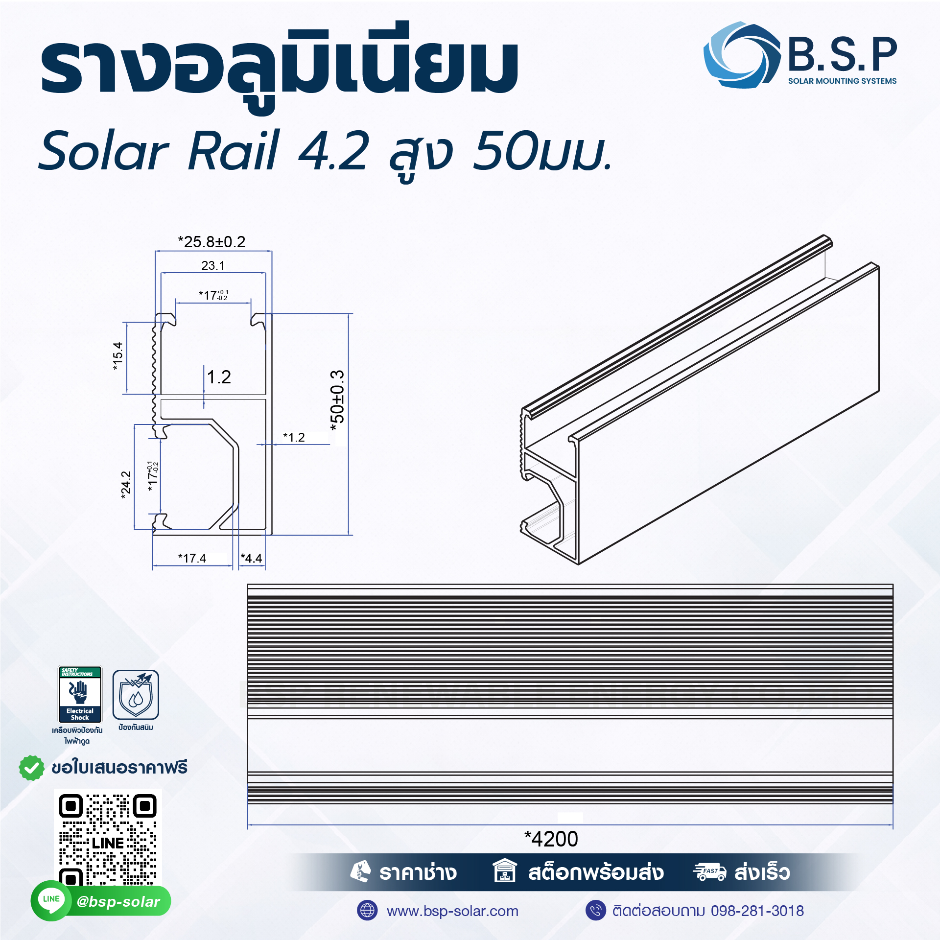 Solar Rail 4.2 เมตร ผลิตจากอลูมิเนียมเกรด AL6005-T5 ซึ่งเป็นวัสดุที่นิยมใช้ในระบบ Solar Mounting Systems เนื่องจาก: